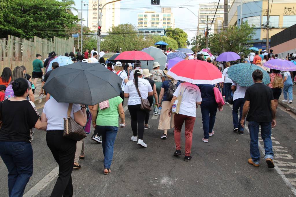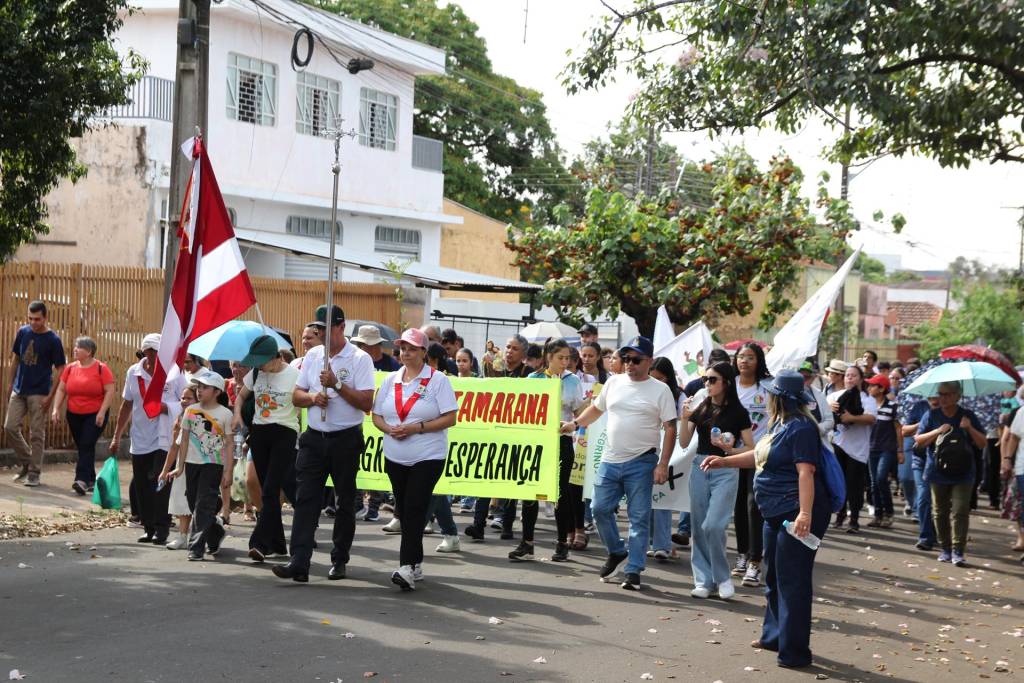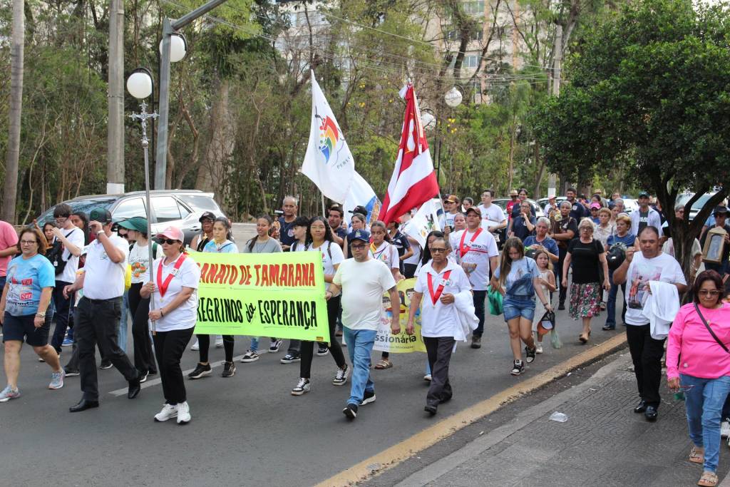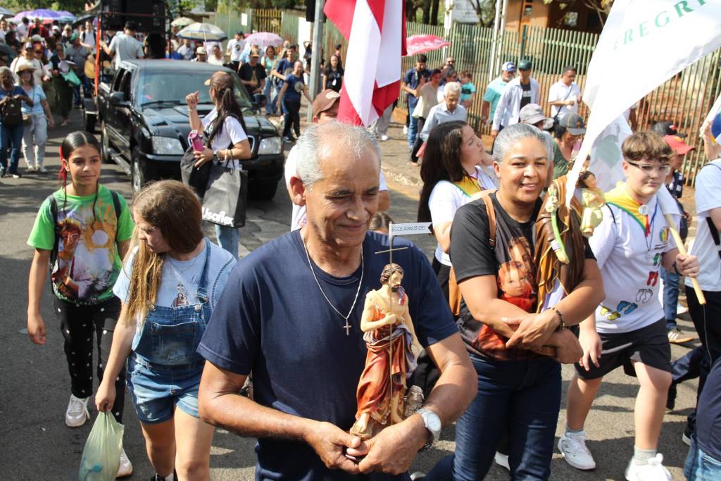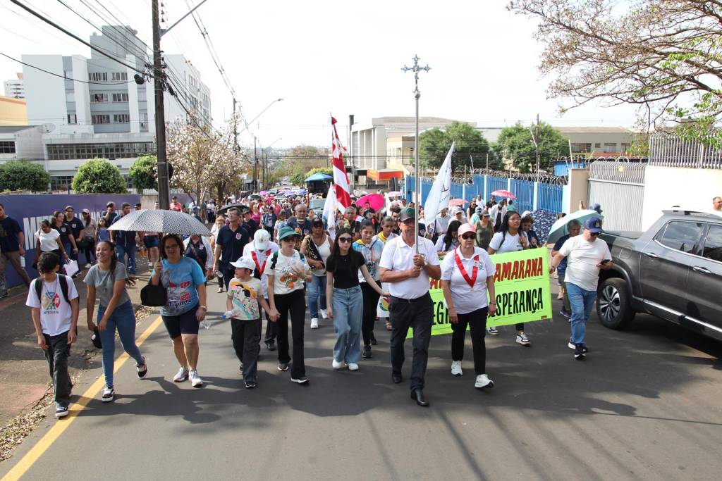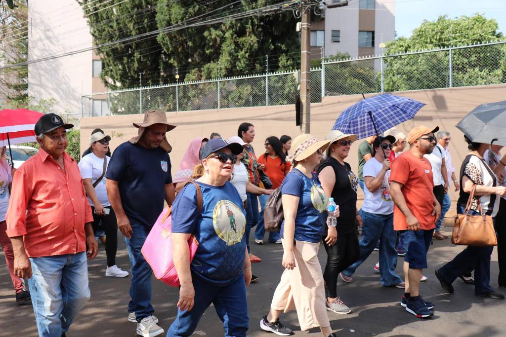 Em seguida, guiados pela esperança e com coragem diante do forte calor, cerca de 500 peregrinos seguiram em caminhada até a Catedral Metropolitana de Londrina, onde foram acolhidos pela equipe local. Ali, a Santa Missa foi presidida pelo padre Joel e concelebrada pelo padre Luciano, pároco da Paróquia São João Batista de Guaravera, e pelo padre Armando Tomé, das paróquias São José de Irerê e de Paiquerê, coroando o itinerário de fé e comunhão.
